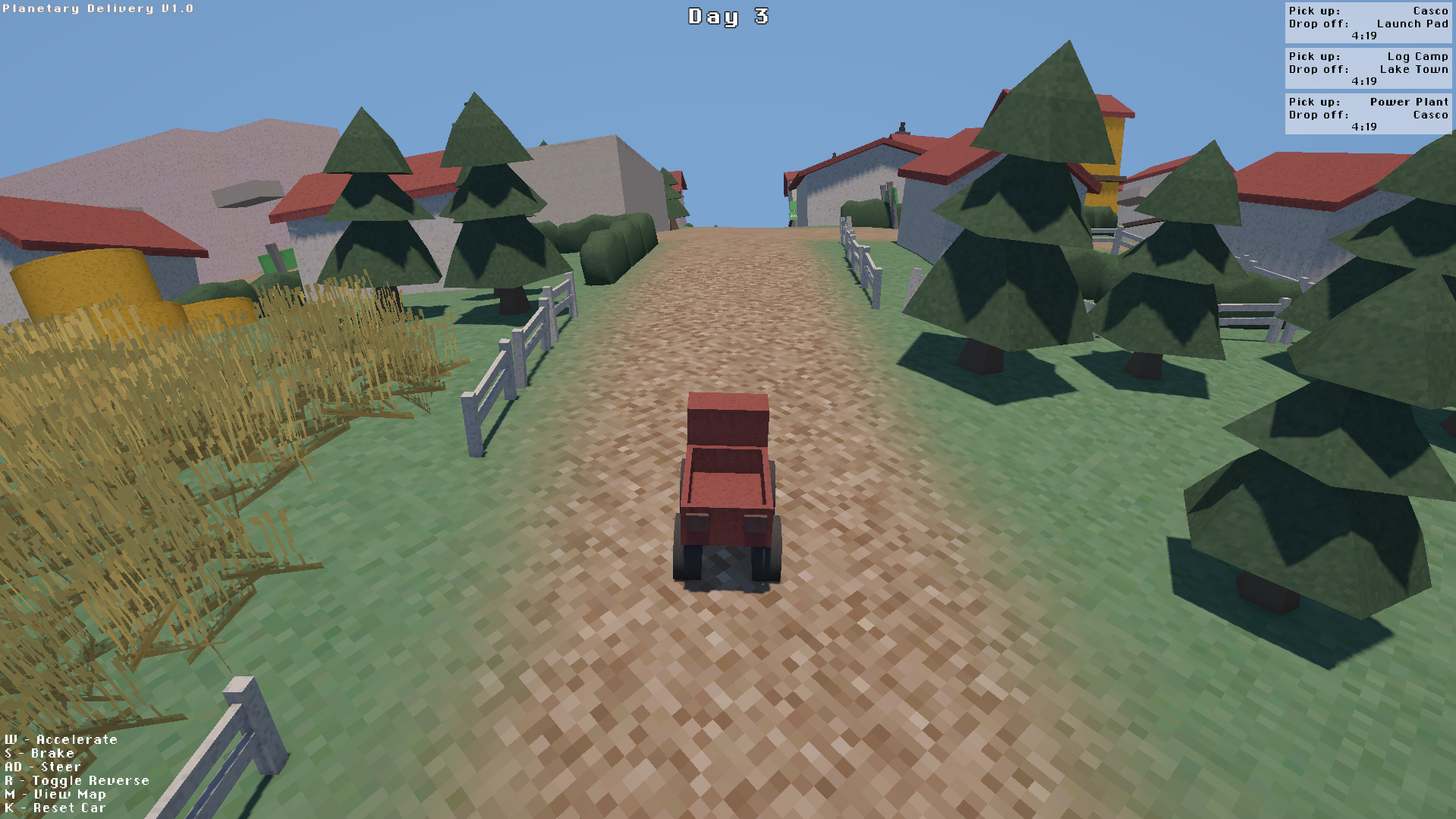 Deliver packages between eight different locations on a small planet within a time limit. As you learn the map and improve your driving skills, you can complete more deliveries in less time.